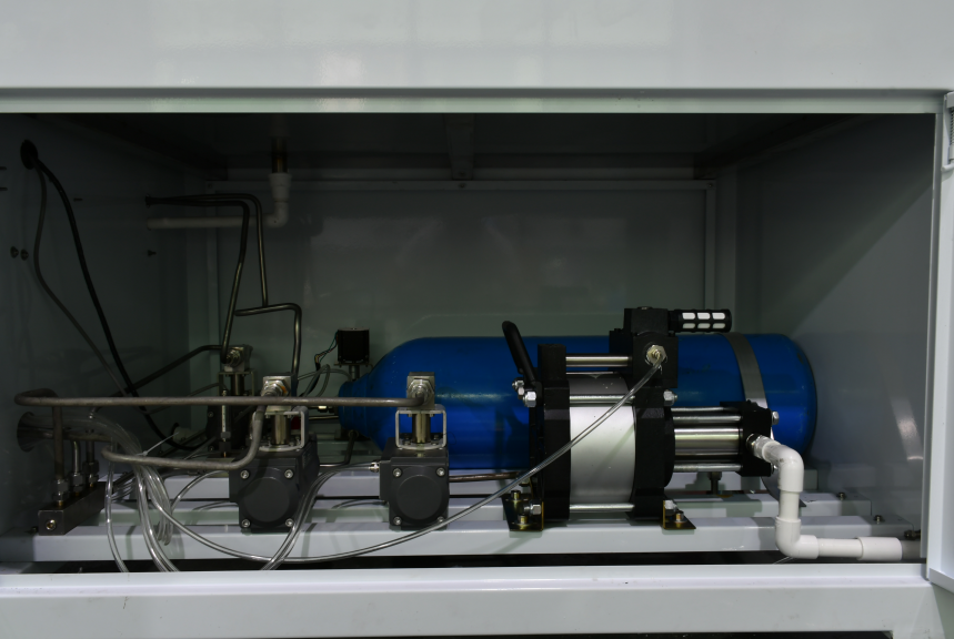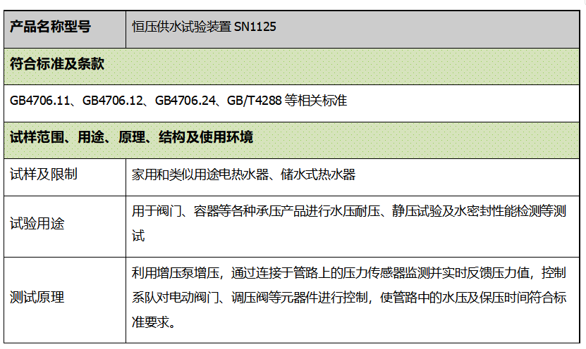 GB4706.11、GB4706.12、GB4706.24、GB/T4288等相关标准利用增压泵增压,通过连接于管路上的压力传感器监测并实时反馈压力值,控制系队对电动阀门、调压阀等元器件进行控制,使管路中的水压及保压时间符合标准要求。