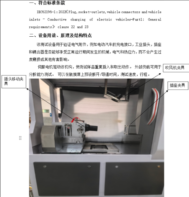该测试设备用于验证电气附件,例如电动汽车的充电接口,工业插头,插座和耦合器是否能够承受正常运行期间发生的机械,电气和热应力,而不会产生过度磨损或其他有害影响。