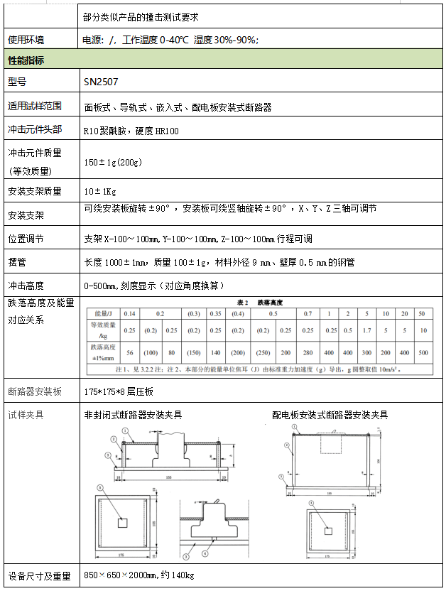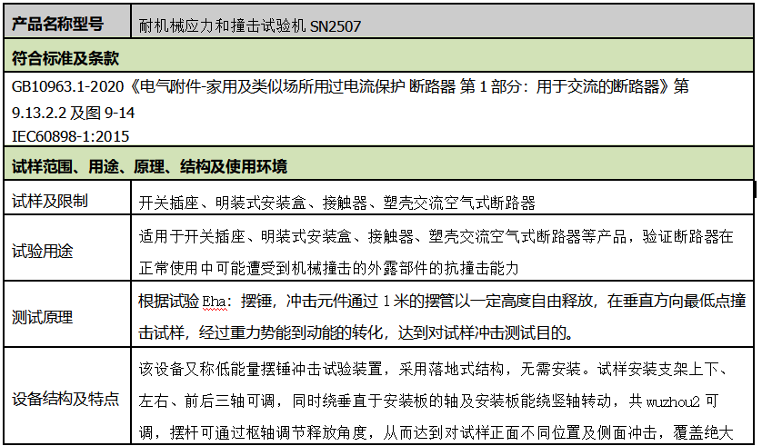 适用于开关插座、明装式安装盒、接触器、塑壳交流空气式断路器等产品,验证断路器在正常使用中可能遭受到机械撞击的外露部件的抗撞击能力 根据试验Eha:摆锤,冲击元件通过1米的摆管以一定高度自由释放,在垂直方向*低点撞击试样,经过重力势能到动能的转化,达到对试样冲击测试目的。