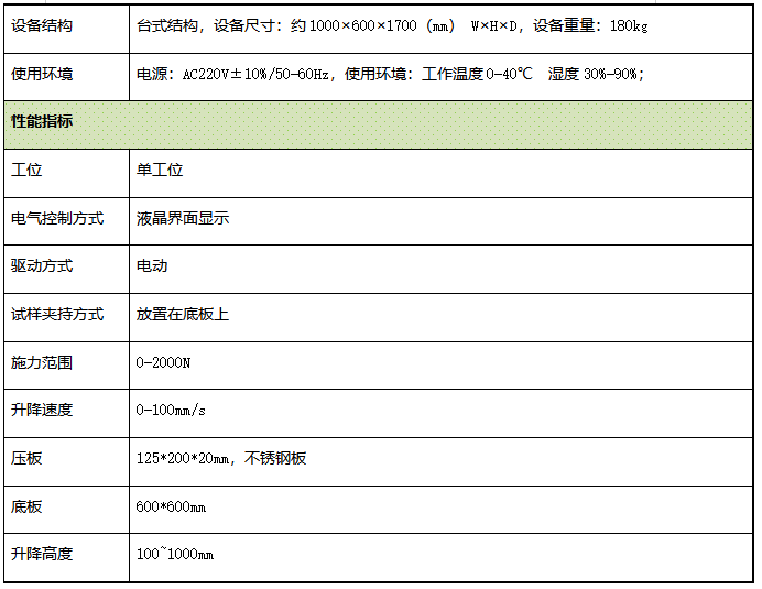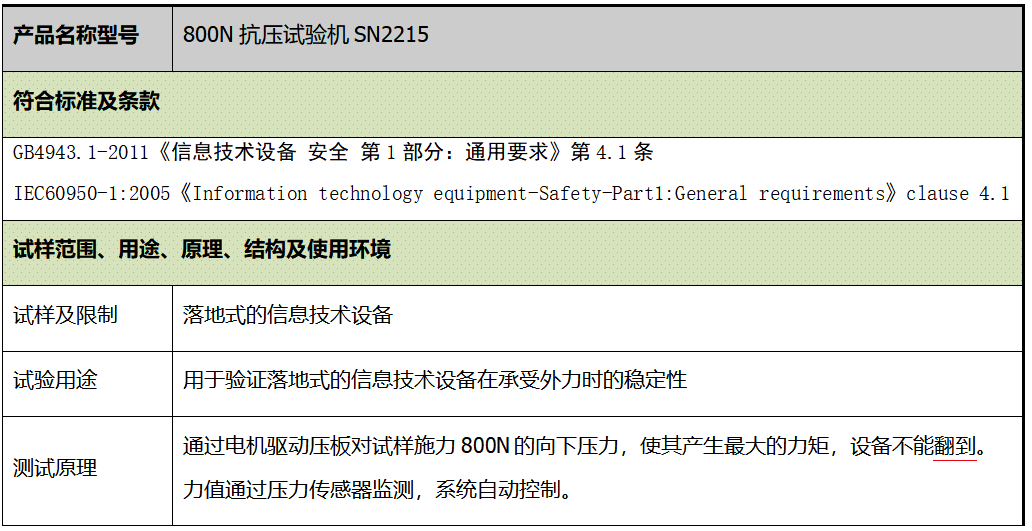 用于验证落地式的信息技术设备在承受外力时的稳定性 通过电机驱动压板对试样施力800N的向下压力,使其产生*大的力矩,设备不能翻到。力值通过压力传感器监测,系统自动控制。
