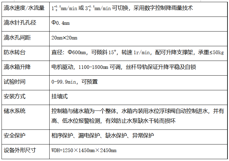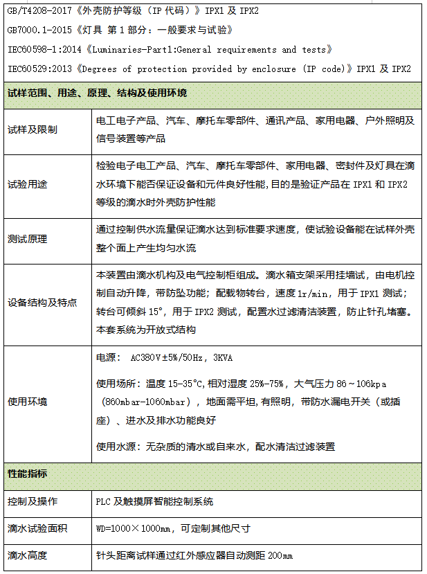 检验电子电工产品、汽车、摩托车零部件、家用电器、密封件及灯具在滴水环境下能否保证设备和元件良好性能,目的是验证产品在IPX1和IPX2等级的滴水时外壳防护性能 通过控制供水流量保证滴水达到标准要求速度,使试验设备能在试样外壳整个面上产生均匀水流