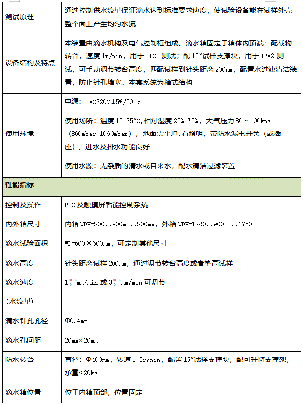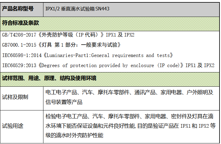 检验电子电工产品、汽车、摩托车零部件、家用电器、密封件及灯具在滴水环境下能否保证设备和元件良好性能,目的是验证产品在IPX1和IPX2等级的滴水时外壳防护性能 通过控制供水流量保证滴水达到标准要求速度,使试验设备能在试样外壳整个面上产生均匀水流