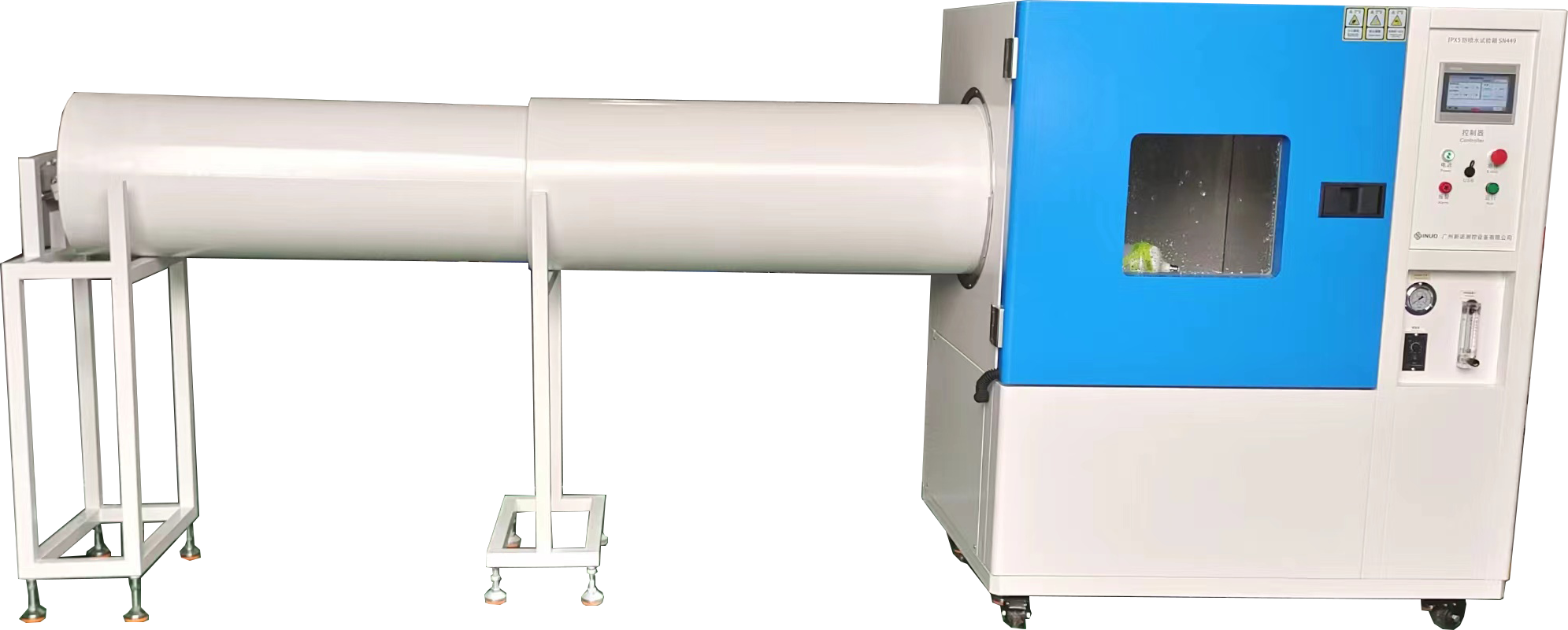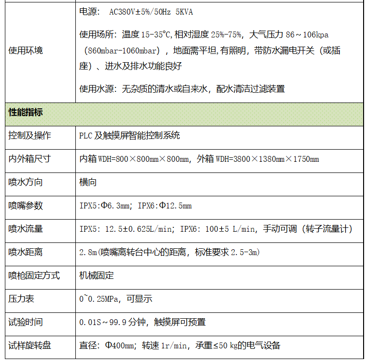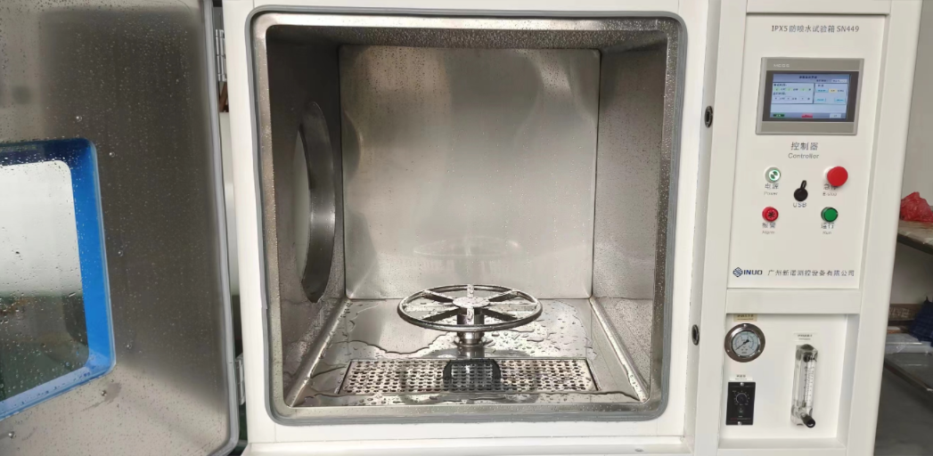 检验电子电工产品、汽车、摩托车零部件、家用电器、密封件及灯具在喷水环境下能否保证设备和元件良好性能,目的是验证产品在IPX5和IPX6等级的喷水时外壳防护性能 通过控制供水流量保证喷水达到标准要求速度,使试验设备的外壳在所有可能方向承受喷水试验
