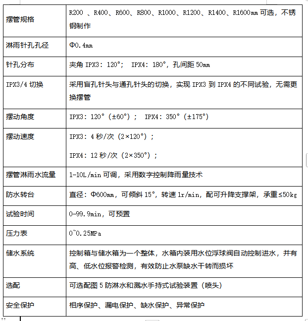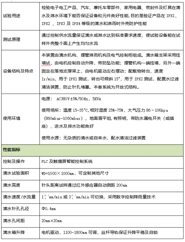 检验电子电工产品、汽车、摩托车零部件、家用电器、密封件及灯具在滴水及淋水环境下能否保证设备和元件良好性能,目的是验证产品在IPX1、IPX2 、IPX3及IPX4等级的滴水和淋雨时外壳防护性能 通过控制供水流量保证滴水或淋水达到标准要求速度,使试验设备能在试样外壳整个面上产生均匀水流