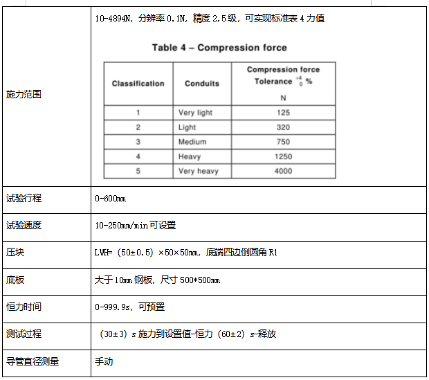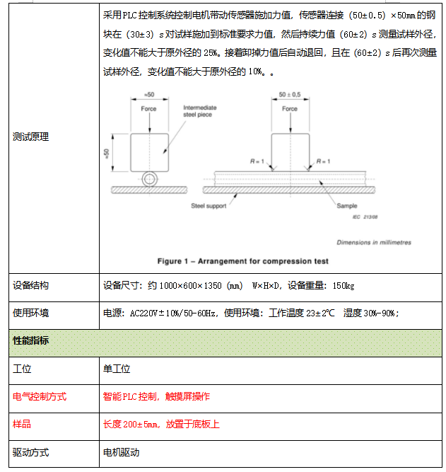 用于考核金属、非金属和复合导管受挤压后的机械性能是否满足标准的要求 采用PLC控制系统控制电机带动传感器施加力值,传感器连接(50±0.5)×50mm的钢块在(30±3)s对试样施加到标准要求力值,然后持续力值(60±2)s测量试样外径,变化值不能大于原外径的25%。接着卸掉力值后自动退回,且在(60±2)s后再次测量试样外径,变化值不能大于原外径的10%