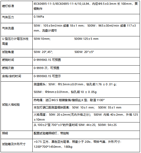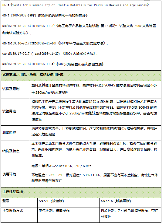 模拟电工电子产品周围发生着火时早期阶段火焰的影响,以便通过模拟技术评定着火危险程度。主要用于对塑料及其他非金属材料部件样品、固体材料和按ISO845的方法测定时视在密度不小于250kg/m³的泡沫塑料的相对燃烧特性进行水平、垂直可燃性试验 通过控制燃气流量,且控制施焰时间,达到控制对试样施加的火焰等效热值,模拟评定着火危险程度