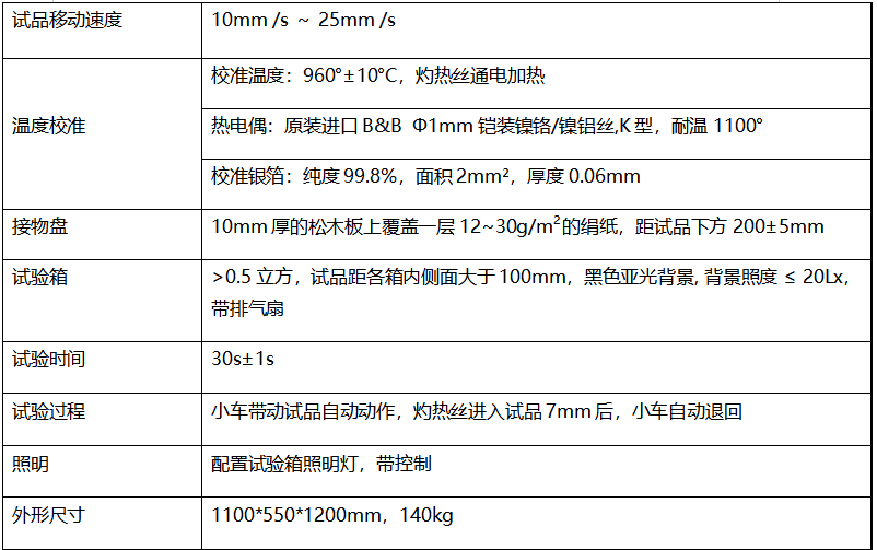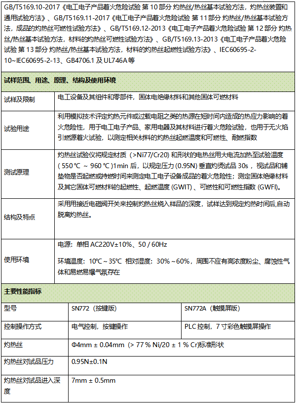GB/T5169.10-2017《电工电子产品着火危险试验 第10部分 灼热丝/热丝基本试验方法,灼热丝装置和通用试验方法》、GB/T5169.11-2017《电工电子产品着火危险试验 第11部分 灼热丝/热丝基本试验方法,成品的灼热丝可燃性试验方法》、GB/T5169.12-2013《电工电子产品着火危险试验 第12部分 灼热丝/热丝基本试验方法,材料的灼热丝可燃性试验方法》、GB/T5169.13-2013《电工电子产品着火危险试验 第13部分 灼热丝/热丝基本试验方法,材料的灼热丝起燃性试验方法》、IEC60695-2-10~IEC60695-2-13、GB4706.1及UL746A等 利用模拟技术评定灼热元件或过载电阻之类的热源在短时间内造成的热应力影响的着火危险性,用于电工电子产品、家用电器及其材料进行着火危险试验,也用于无火焰引燃源着火试验,以测定相关材料的灼热丝起燃温度和可燃性、耐燃指数 灼热丝试验仪将规定材质(>Ni77/Cr20) 和形状的电热丝用大电流加热至试验温度 ( 550 ℃ ~ 960 ℃ )1min 后,以规定压力 (0.95N) 垂直灼烫试品 30s ,视试品和铺垫物是否起燃或持燃时间来测定电工电子设备成品的着火危险性;测定固体绝缘材料及其它固体可燃材料的起燃性、起燃温度 (GWIT) 、可燃性和可燃性指数 (GWFI)。