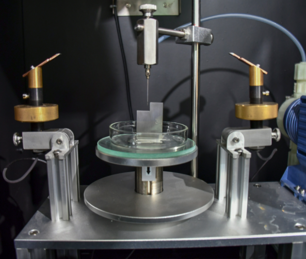 漏电起痕试验(电痕化指数试验)是在固体绝缘材料表面上,在规定尺寸 ( 2mm × 5mm ) 的铂电极之间,施加某一电压并定时 (30s) 定高度 ( 35mm ) 滴下规定液滴体积的导电液体 (0.1%NH 4 CL) ,用以评价固体绝缘材料表面在电场和潮湿或污染介质联合作用下的耐漏电性能,测定其相比电痕化指数 (CT1) 和耐电痕化指数 (PT1)