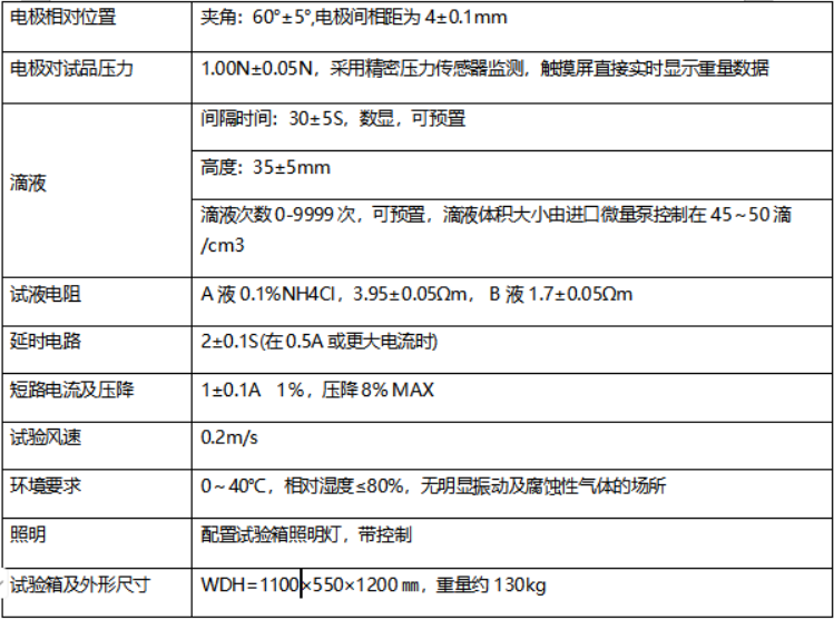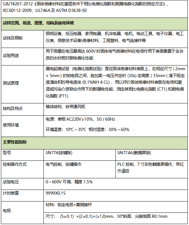 GB/T4207-2012《固体绝缘材料在潮湿条件下相比电痕化指数和耐漏电痕化指数的测定方法》、IEC60112-2009、UL746A及ASTM D3638-92 用于测量在电压*高达600V时固体电气绝缘材料在电场作用下表面暴露于含杂质的水时相对耐电痕化性能