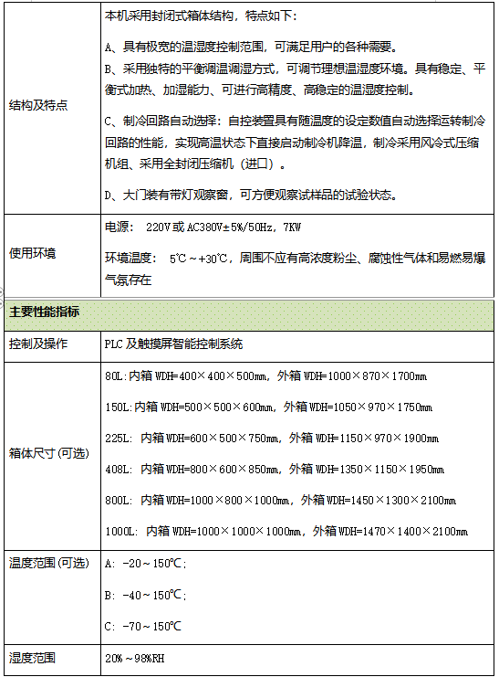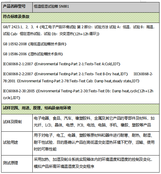 用于对电子、电工、电器、塑胶等原材料和器件进行耐寒、耐热、耐湿、耐干性试验,目的是确认产品在高低温交变湿热环境下贮存、运输、使用时的可靠性能