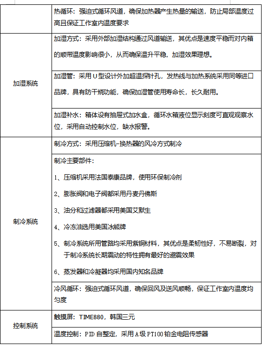 采用加热、加湿及制冷系统实现箱体内的环境温度和湿度的控制及变化,模拟产品所需环境温湿度及交变程序