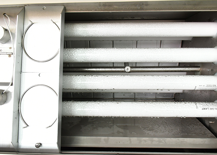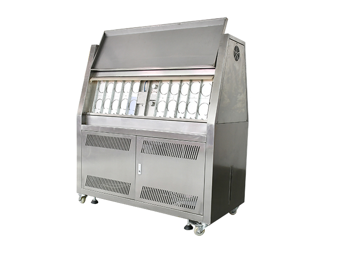 UV紫外线加速老化箱的结构是一个不锈钢内箱空间内,安装两排各四支灯管,来模拟紫外光,通过加湿系统把内箱温度提升来模拟潮湿环境,再配合喷淋系统来模拟下雨,三个不同的环境通过程序设定使之交替循环。