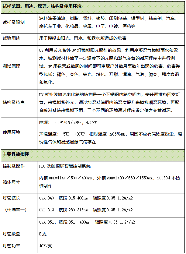 UV利用荧光紫外UV灯模拟阳光照射的效果,利用冷凝湿气模拟雨水和露水,被测试材料放至一定温度下的光照和潮气交替的循环程序中进行测试。UV用数天或数周的时间即可重现户外数月至数年出现的危害。危害类型包括:褪色、变色、失光、粉化、开裂、浑浊、气泡、脆变、强度衰退和氧化