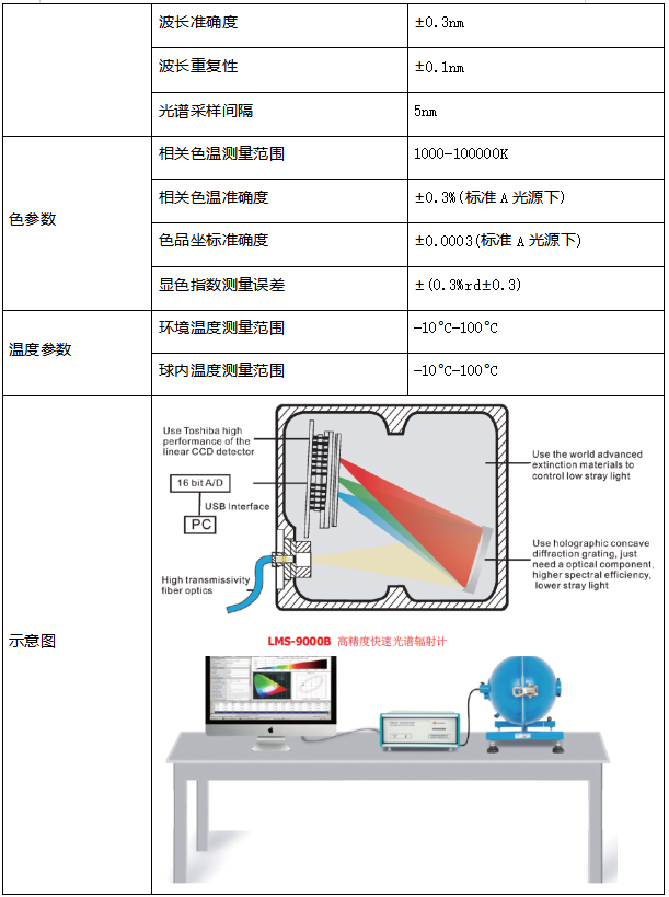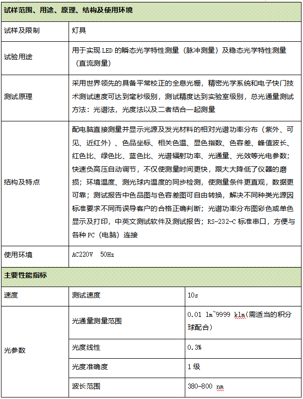 采用****的具备平常校正的全息光栅,精密光学系统和电子快门技术测试速度可达到毫秒级别,测试精度达到实验室级别,总光通量测试方法:光谱法,光度法以及二者结合一起测量