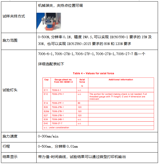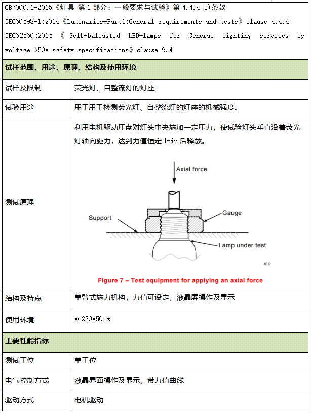 用于用于检测荧光灯、自整流灯的灯座的机械强度。